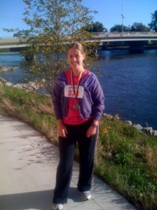 I finished at 43:02, a 9:55 pace. I didn’t know what to expect for a 7k, so my unofficial goal for a “challenging” but unknown course was sub-45 minutes. As soon as you crossed the line (and they ripped off the bottom of your bib), the organizer shook your hand and gave you a medal. It’s my very first medal, and even though it’s generic, with no race name, date or anything on it, I grinned when I put it on. I finished 39th out of 76 in my “division.” They only  had two divisions for each gender: Under 15 and 15 and up, which seems odd. The winner finished in a blazing 24:57 – a pace of 5:45. Incredible!
