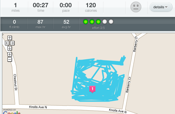 In fact, my DailyMile friend Mike recently posted this map of his most recent “run.” You see, Mike had finished his long run for the weekend and realized he was a mile shy of 60 for the week. Being so close to a milestone like that is enough to drive you crazy. So, at his wife’s suggestion, he strapped on his Garmin while mowing the lawn to get one more mile in, albeit at not nearly the same intensity of a run. (Though he did note his back yard pace was slower, as he had to pick up the kids’ toys.)