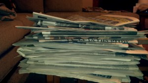 The newspaper pile. I’ve always subscribed to two papers (the Tribune and the Elgin Courier-News), but for my Finance class, we also had to read the Wall Street Journal. I’ve actually grown to really like reading the WSJ – their foreign coverage is especially fantastic. I just don’t have time to read 3 daily newspapers, yet I can’t bear to throw away anything unread. Every week for class, I skimmed through the relevant sections, setting others aside to read later. As a result, quite the pile developed on my coffee table. Digging through, I realized the bottom of the pile had a couple sections from Feb 9. I cleared through much of it this weekend, and hope to kill off the pile entirely before classes resume on March 29.